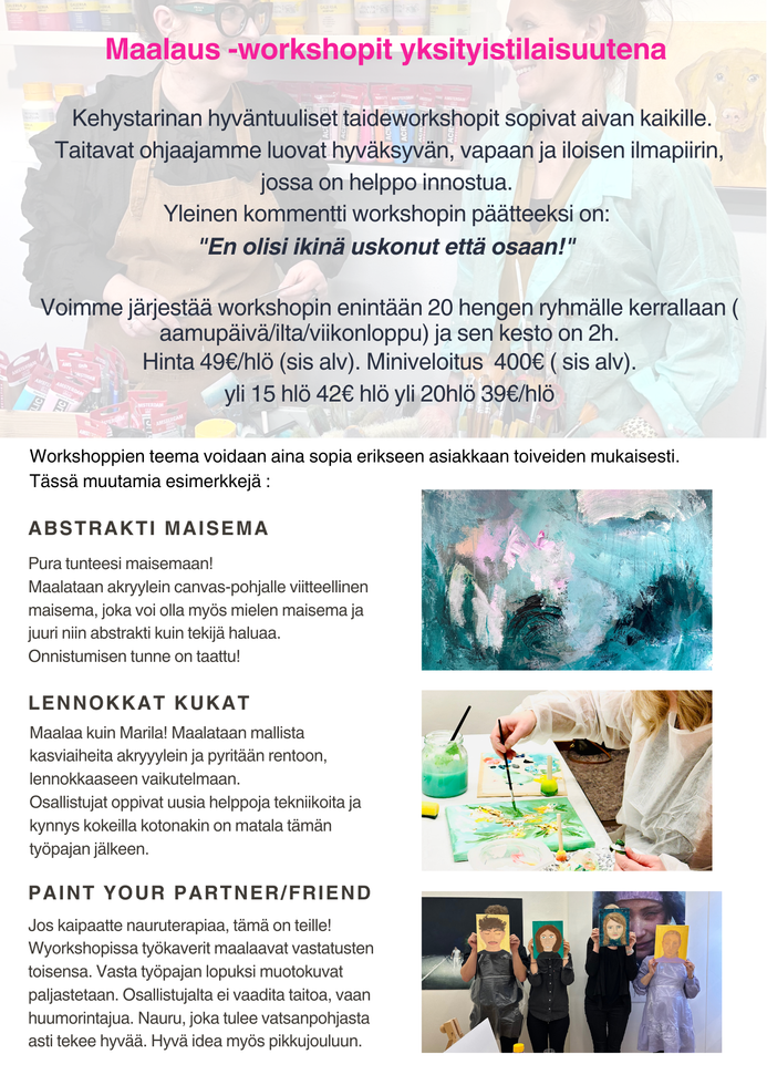 Järjestämme viihteellisiä maalaus workshoppeja alakerran tilassamme.